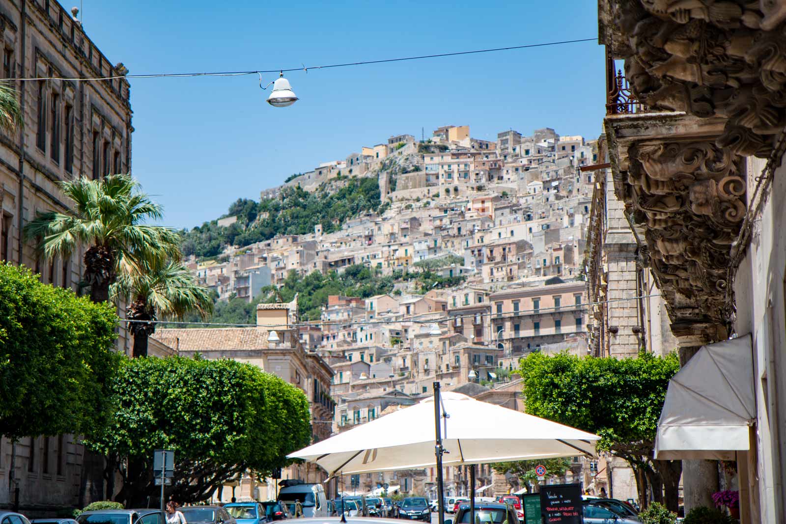 La strada che collega Scicli con Modica è immersa nella natura, tra ulivi, carrubi, curve e rettilinei panoramici. Sembra di essere in uno spot, anche per come sono mantenute qui attività, terreni, collegamenti: la capotte resta giù, e ci godiamo il profumo di una natura che qui è potente e piena.